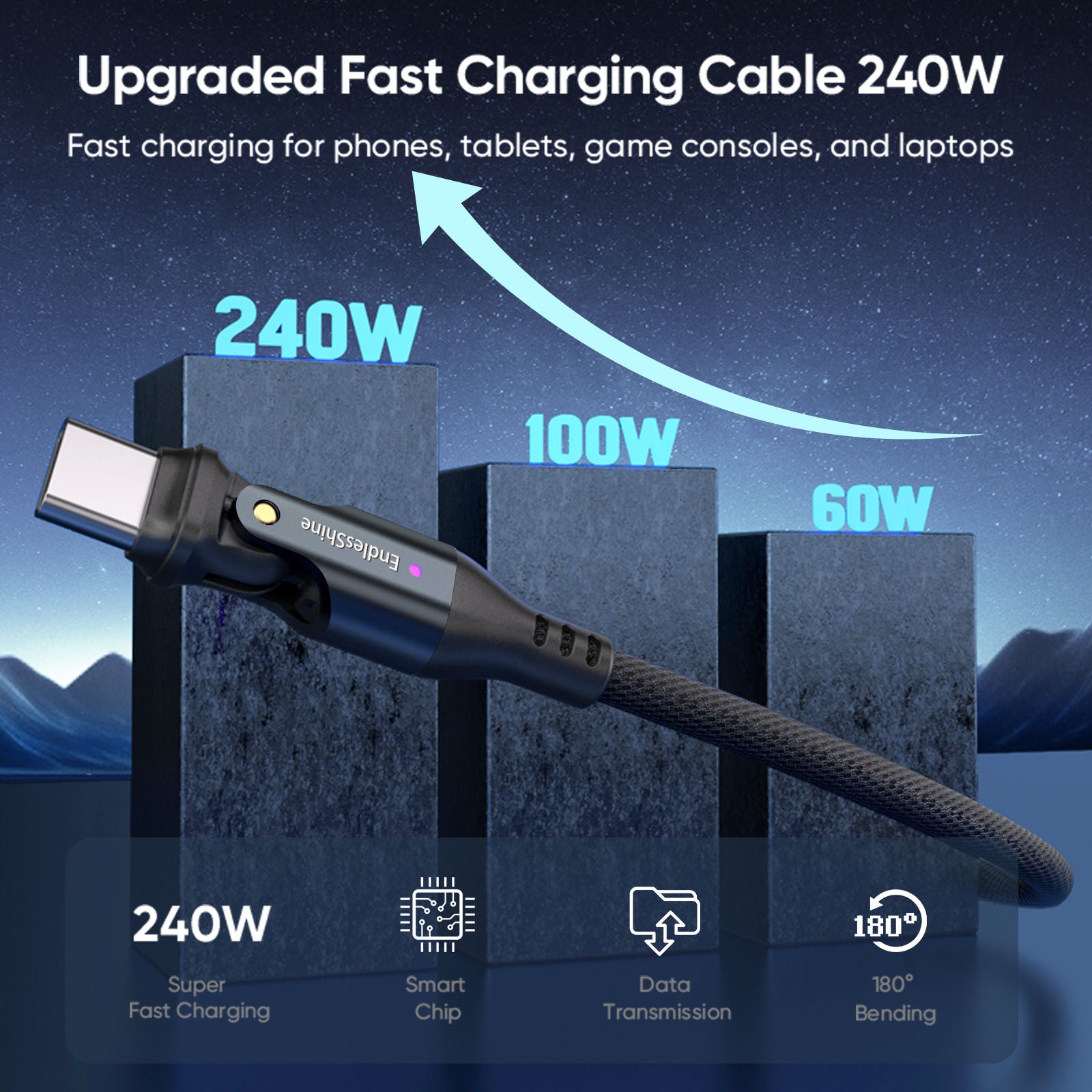 - ⚡【240W USB C Fast Charging】C to c type fast charging cable supports PD 3.0/4.0 and QC 3.0/4.0/5.0 fast charging up to 240W and is compatible with USB-C Power Delivery adapters of different power sizes, such as 30W/45W/...100W/120W/240W.Pair up EndlesShine usb type c cable with a 240W charger to power up MacBook Pro 16” up to 40% in 30min; Charger to power up Galaxy S22 Ultra up to 100% in 1 hour, usb c cord is the same as the manufacturer's matching charging cable speed.(Charger not included).