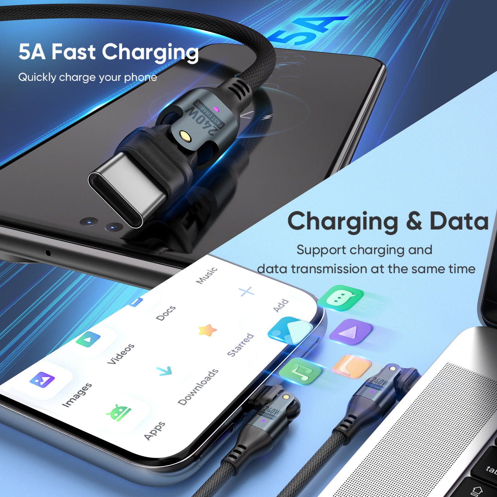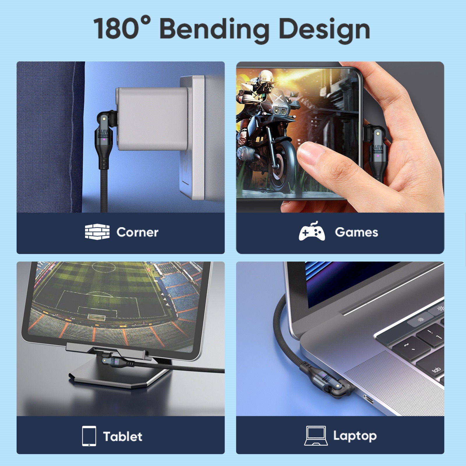 - ⚡【Durable】right angle usb c cable 180 degree rotating head design combined with high grade nylon braided cable manufacturing, which lasts longer than ordinary cables under the right usagel. Nylon-Braided Cords is through 40,000+ bending life tests, it is proved that the nylon braided fiber can protect the charging cable very well. Thunderbolt 4 cable used for travel,beds, sofas, car charger and other places. cable tipo c LED design allows us to find cables faster in the dark.